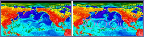 На фрагментах радиотеплового поля из электронной коллекции отдела 55 ИКИ GLOBAL-Field (http://www.iki.rssi.ru/asp/ ) показана северная часть Тихого океана, над приэкваториальной частью акватории которого продвигается в зональном потоке цепочка из 4 – 5 вихрей.