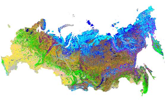 Созданный комплекс программ был применен для формирования обучающей выборки и классификации спутниковых данных MODIS. В результате классификации был получен предварительный вариант карты типов земного покрова на территорию России (рис. 10). Легенда карты в настоящее время включает 17 классов, в том числе 8 классов покрытых лесом территорий. Ведется работа валидации полученной карты и усовершенствованию алгоритма.