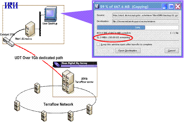 Был организован и успешно проведен эксперимент по передаче больших объемов данных по межконтинентальным выделенным каналам с использованием специализированных протоколов передачи данных (UDT). В результате эксперимента была достигнута скорость загрузки 711 Mbps (844Mbps в пиках) в режиме диск-диск. Полученный результат является наибольшей официальной зарегистрированной скоростью передачи данных в рамках одного сеанса между Российской Федерацией и Соединенными Штатами Америки.
