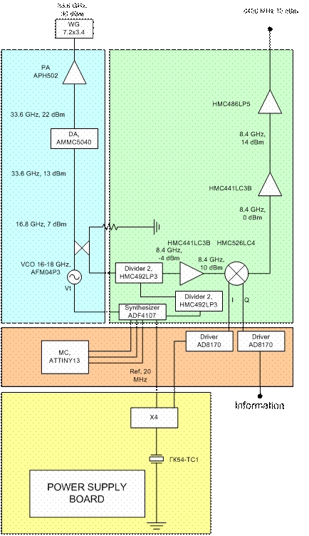 умножается по частоте в 2 раза микросхемой XDH150. Выходная мощность удвоителя частоты