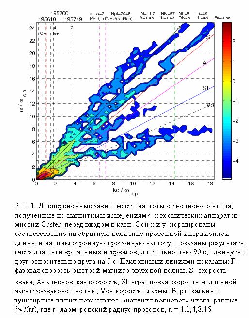 3) В составе этих колебаний обычно присутствуют волны, показывающие на отдельных участках дисперсионных зависимостей линейный ход изменения частоты от волнового числа, причем фазовые скорости волн на этих участках часто совпадают с одной из известных МГД волновых мод (Рис. 1).