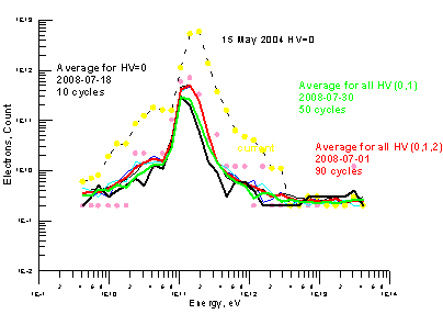 электронных спектров, полученных при трех разных уровней напряжений для питания