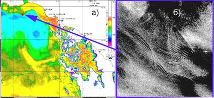 Поле поверхностной температуры, восстано-вленное из данных AVHRR NOAA от 11.07.06 в 14:40 UTC; б) радиолокационные образы