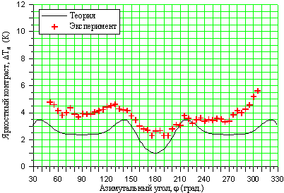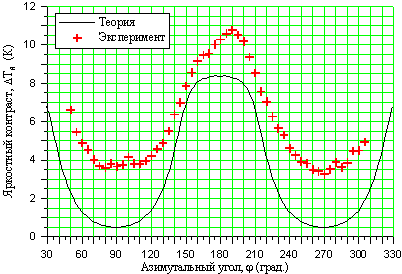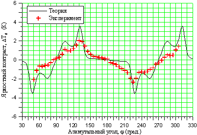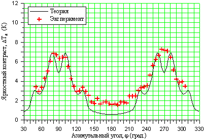 поверхности от азимутального угла при вертикальном угле зондирования 20°. Крестики – эксперимент,