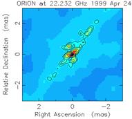 Проведен многолетний цикл исследований структуры активной области в плотном молекулярном облаке Туманности Ориона. Активные процессы формирования протозвезды сопровождались мощным мазерным излучением в линиях водяного пара (λ=1.35 см). Ширина линии не превышала 0.4 км/с (35 кГц). Излучение достигало F £ 8 МЯн и было линейно поляризовано (Р ≈ 70%). Наблюдалось экстраординарное вращение плоскости поляризации c¢ ≈ 25о/км/с, рис.1 (А). Наблюдения проводились методом сверхдальней радиоинтерферометрии в рамках широкого международного сотрудничества на глобальной сети и системе VLBA. Достигнуто предельное угловое разрешение ~10 мксек дуги или 0.005 а.е.