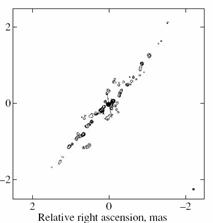 Рис.2 Высококоллимированный биполярный поток – слева (кружок в правом нижнем углу соответствует угловому разрешению 50 мксек дуги). Справа – область эжектора, отрезки прямых соответствуют поляризованному излучению (разрешение 10 мксек).