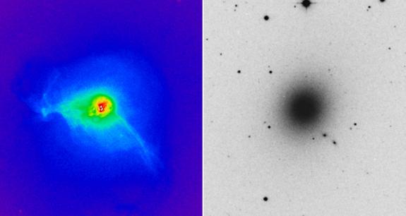 Рис.1 Рентгеновское (слева) и оптическое (справа) изображения галактики М87. Сравнение распределений звезд и горячего газа в общей потенциальной яме позволят измерить вклад нетепловой составляющей в полное давление газа.