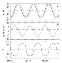 1 Слева: колебания модельного слоя. Jy компонент тока практически постоянен, Jz дивгается за изменением угла наклона (нижняя кривая).