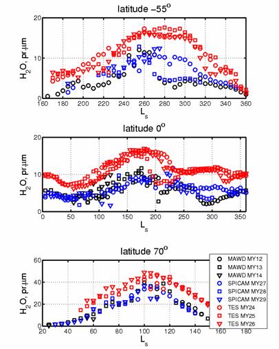 Рис. 1 Сезонное распределение водяного пара за три марсианских