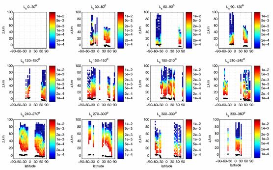 Рис. 1 Вертикальное распределение аэрозольной экстинкции c сезоном и широтой на Марсе