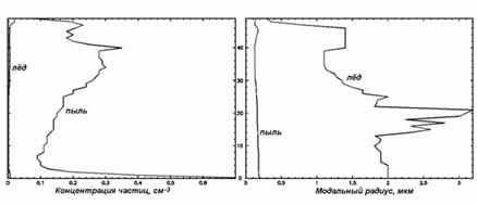 концентрации и размеров для аэрозольных частиц из пыли и водяного льда.