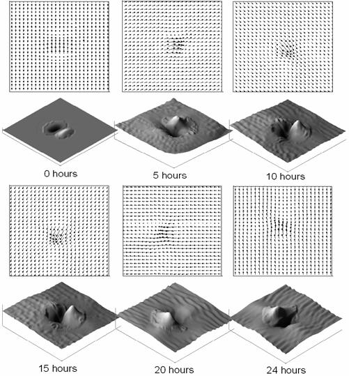 Рис. 2.Эволюция течения жидкости под влиянием силы Кориолиса над горой; верхние графики – поля скоростей, нижние – свободная поверхность.
