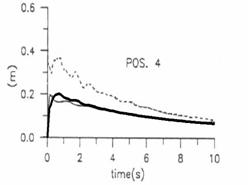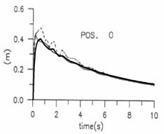 Рис.3. Зависимости глубины жидкости от времени в различных контрольных точках. Прерывная линия – результат, полученный WAF методом, серая сплошная линия – результат измерений в лабораторном эксперименте. Черная жирная линия – результат расчета квазидвухслойным методом.