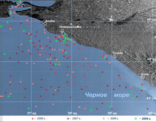 На основе данных спутникового дистанционного зондирования в микроволновом и оптическом диапазонах проведен мониторинг состояния и загрязнения акваторий Черного, Азовского, Балтийского и Каспийского морей. Было принято и обработано более 600 радиолокационных изображений Envisat ASAR и ERS-2 SAR, а также более 100 оптических изображений MODIS Terra/Aqua, MERIS Envisat и Landsat ETM+. Анализ полученных данных позволил выявить основные элементы циркуляции вод в исследуемых морях, выявить основные источники загрязнений водной среды и районы подвергшиеся наибольшим антропогенным загрязнениям. Результаты мониторинга показывают, что в Черном море наиболее часто несанкционированный сброс с судов вод, содержащих нефтепродукты, происходит в северо-западной части моря. В российской акватории по-прежнему наибольшему загрязнению подвергается акватория в районе порта Новороссийск. В то же время, заметно меньше незаконных сбросов с судов выявлено в Керченском проливе, к которому после аварии танкера в ноябре 2007 г. было приковано пристальное внимание общественности и контролирующих организаций. За четыре года спутниковых наблюдений в российском секторе Черноморского бассейна было выявлено 228 случая загрязнений морской поверхности нефтепродуктами в результате судовых сбросов. Индивидуальная площадь пятен варьировалась в пределах от 0,1 до 30 км2. Совокупная площадь загрязнений, содержащих нефтепродукты, составила более 800 км2. Систематизация спутниковых данных по загрязнению Черного моря нефтепродуктами, сброшенными с проходящих судов, позволила выявить районы наиболее частого сброса вдоль судоходных трасс в п. Новороссийск и п. Туапсе, а также на подходе к нефтяному терминалу мыс Железный Рог и в районе Керченского пролива.