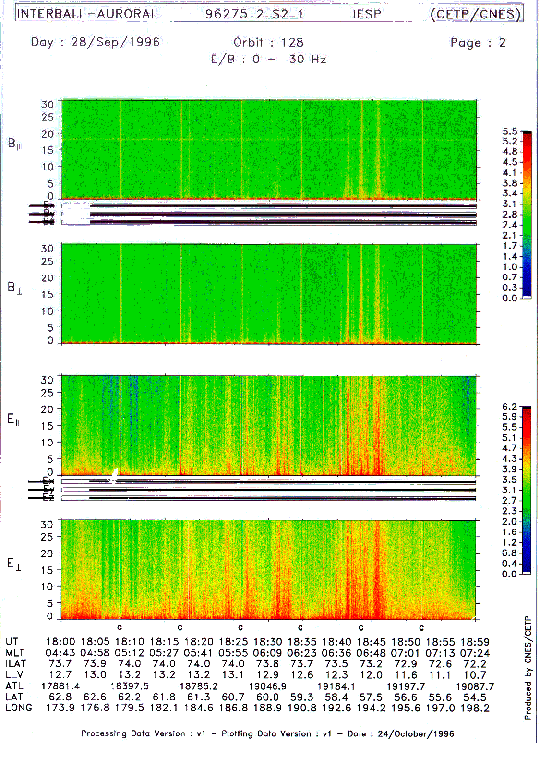 An example of ULF electromagnetic fields detection by the IESP-2M instrument. The figure presented is the dynamic spectrogram. E and B components are measured in satellite coordinates. Observations were made in the auroral region.