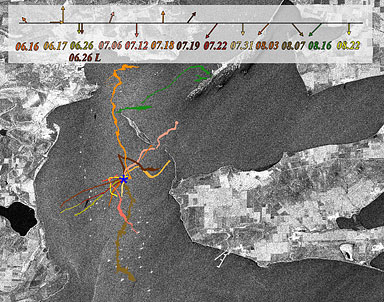 12 ships were wrecked as a result of gale-strength wind and rough sea in Kerch Strait and in the Black Sea on 11th of the November 2007. The tanker “Volgoneft-139”, which transported 4777 tons of black oil broke in two parts and about 2000 tones of mineral oil poured out into the sea. Right away after the disaster the staff of the laboratory of the Aerospace radiolocation of the Earth research department from space IKI RAN was organized disaster consequences satellite monitoring with the help of radiolocation probe data: ASAR Envisat, Radardat, TerraSAR-X and ERS-2 SAR for the pollution scopes definition. The districts suffered from the largest pollution were discovered. The results of satellite data processing were comparing with the results of computational modeling executed by the GOIN staff and with official information. Carried out investigations proved that not only black oil from tanker “Volgoneft-136” got into the sea after the storm, but also mineral oil from the other stranded ships, which tried to save their selves after the storm, pouring out ballast waters comprising mineral oil, and moreover, that is also possible, bunker fuel. During spring-autumn of 2008 in the framework of the operative satellite monitoring of the coastal waters condition and pollution in the sector of Black Sea and Sea of Azov the repeated sea surface pollutions were studying. The spring-summer sea water warming-up brought to the surfacing of the mineral oil settled at the bottom. Moreover, the tanker’s forebody with the mineral oil remains was staying at the place of the disaster till 13th of august 2008, and it also contributed to the constant sea surface pollutions. During the June-August 2008, the series of satellite radar images were received. The oil film from the disaster place was distinctly developed on it. These films spreaded to several kilometers under the wind and stream influence, were, in a sense, tracers, which let us to study circulating process in Kerch Strait. The most informative shots and their processing results are represented at the website http://www.iki.rssi.ru/asp/dep_moni.htm .