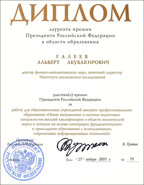 21 декабря 2005г. вручена премия Правительства РФ в области науки и