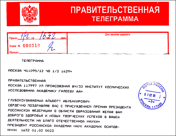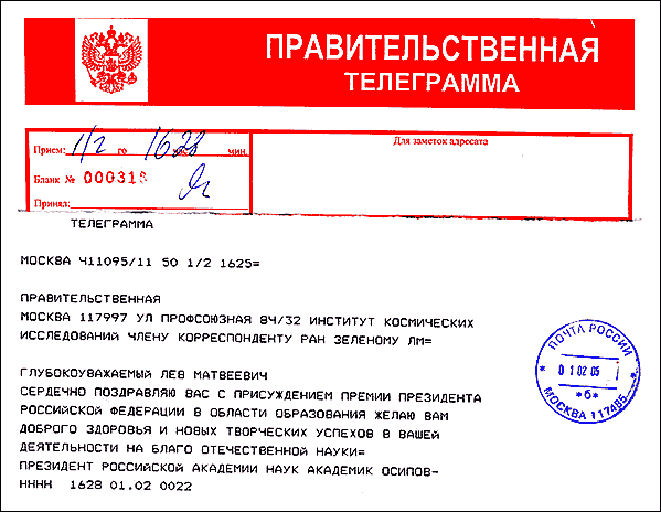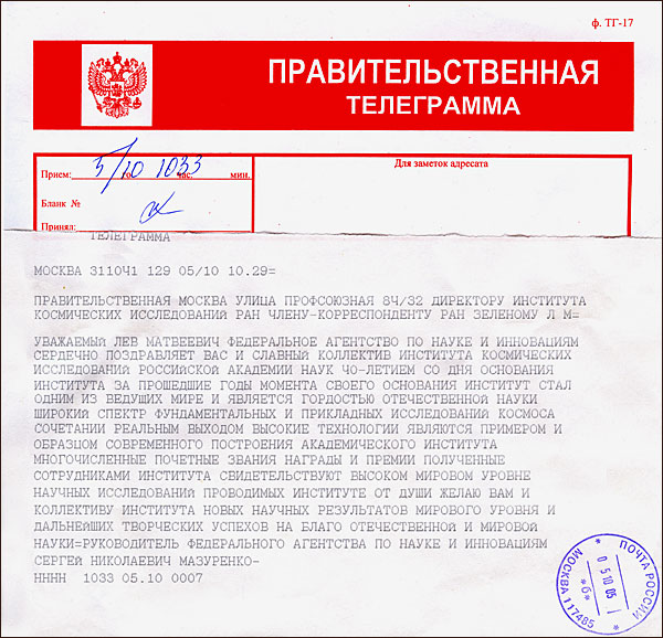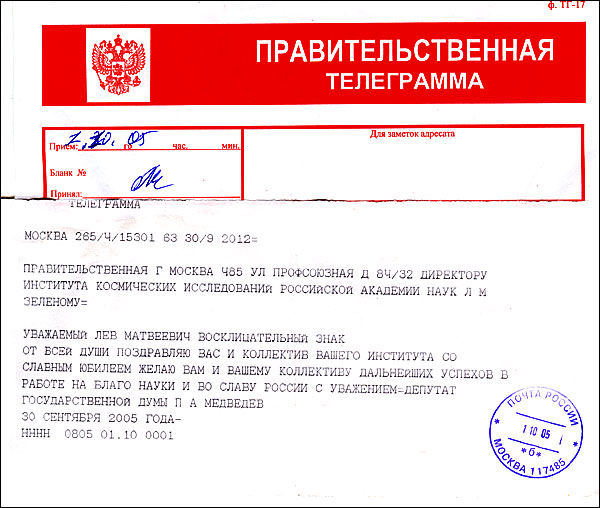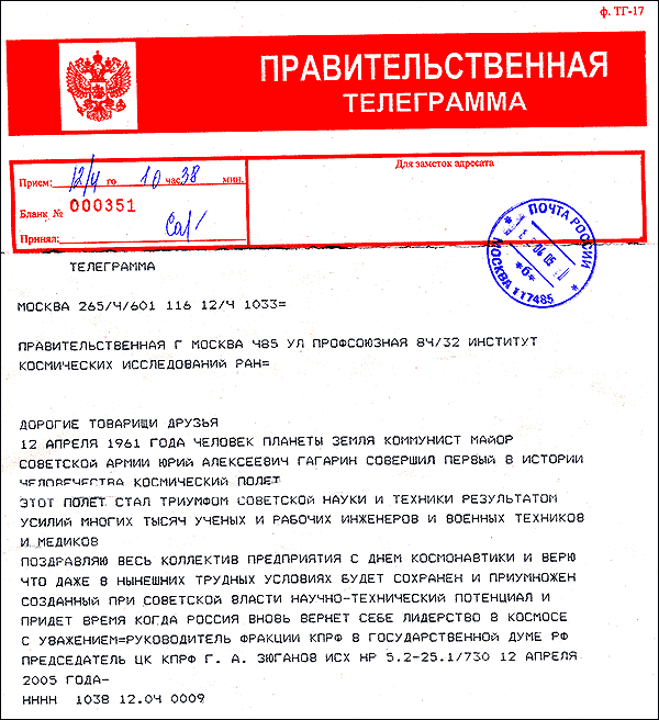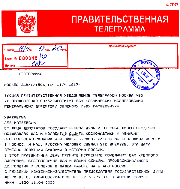 Институт Космических Исследований поздравили с праздником - Днем космонавтики и авиации заместитель председателя Государственной Думы ФС РФ В.В.Жириновский и руководитель фракции КПРФ в Государственной Думе ФС РФ, председатель ЦК КПРФ Г.А.Зюганов: