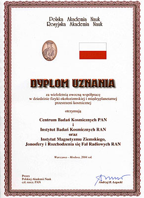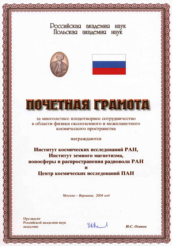 ИКИ РАН, ИЗМИРАН и Центр космических исследований ПАН за многолетнее сотрудничество в области физики околоземного и межпланетного пространства награждены Почетной грамотой Российской и Польской Академий Наук!