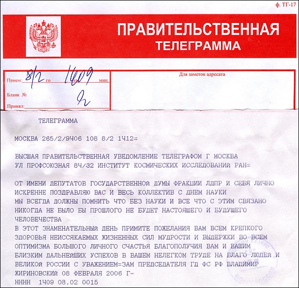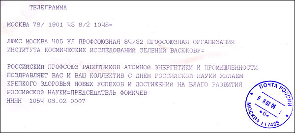 8 февраля 2006г. Поздравления ИКИ РАН с днем российской науки.