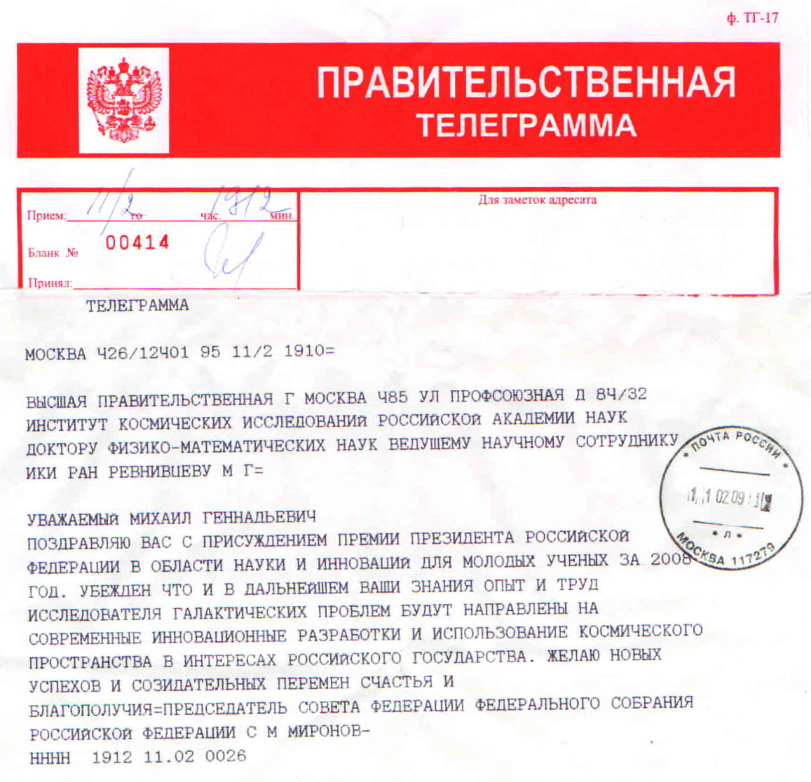 Фото пресс-службы Президента России | 5 февраля 2009 г. Ревнивцеву Михаилу Геннадьевичу, ведущему научному сотруднику ИКИ РАН, присуждена премия Президента Российской Федерации в области науки и инноваций для молодых ученых за 2008 год за результаты научных исследований, вносящих существенный вклад в понимание природы галактических и внегалактических источников рентгеновского излучения.