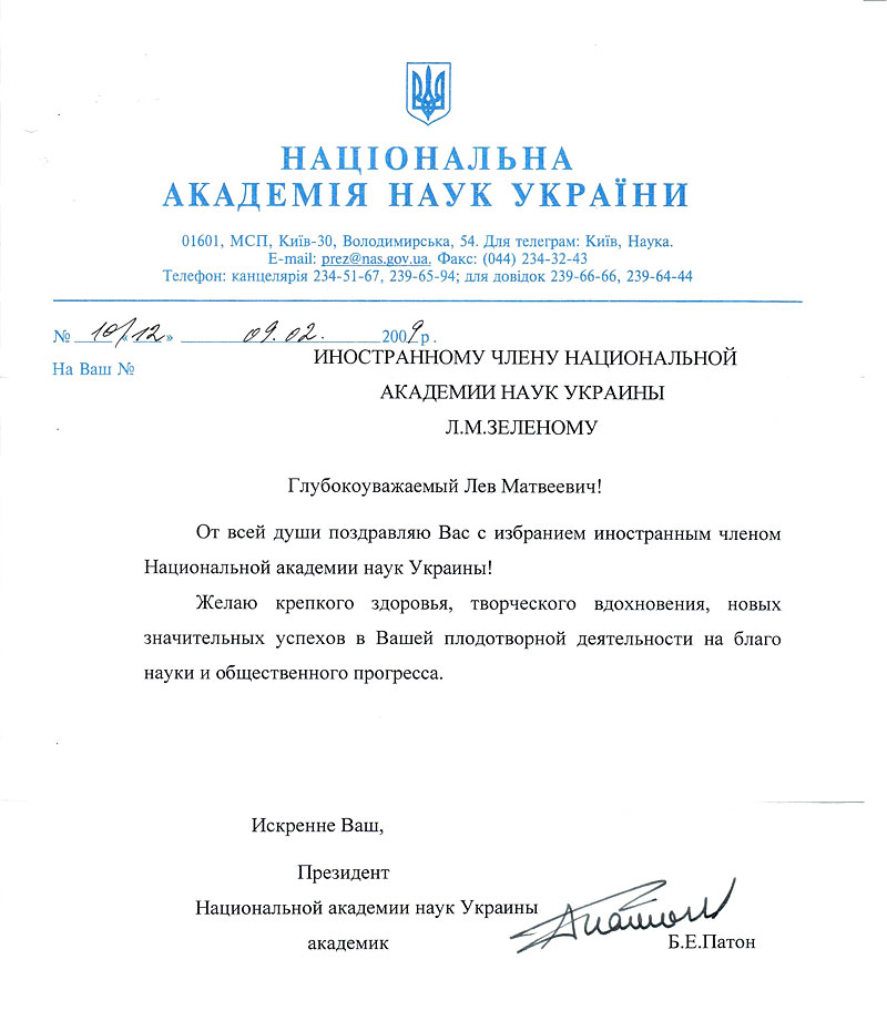 4 февраля 2009 г. академик Зелёный Лев Матвеевич был избран иностранным членом Национальной академии наук Украины. Наши поздравления!