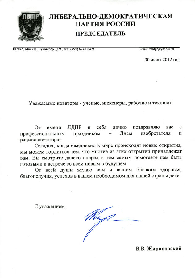 30 июня 2012. Поздравление коллектива ИКИ РАН с днем изобретателя и рационализатора от Жириновского В.В.