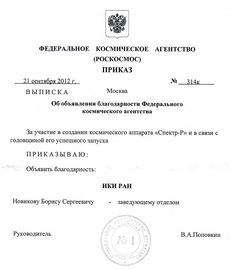 21 сентября Федеральное космическое агентство (РОСКОСМОС) объявило благодарность Новикову Борису Сергеевичу - заведующему отделом ИКИ РАН за участие в создании космического аппарата "Спектр-Р" в связи с годовщиной его успешного запуска.