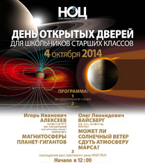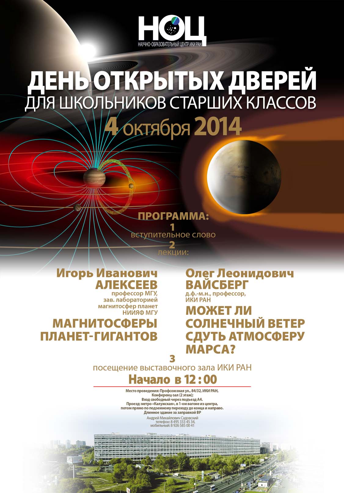 • 4 октября 2014 г. в ИКИ РАН состоится традиционный «День открытых дверей» для школьников старших классов. Начало в 12 часов.