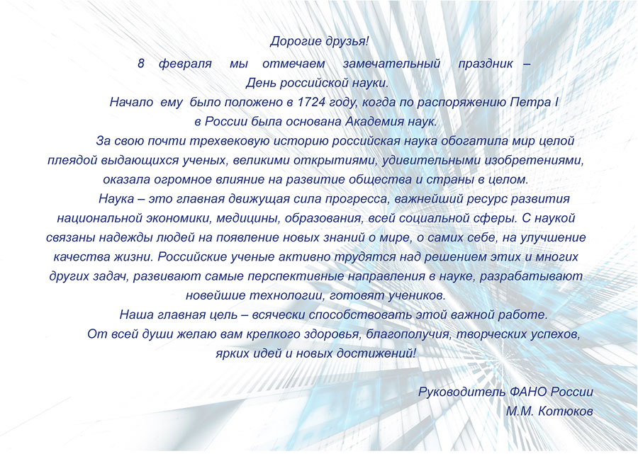 • Поздравление руководителя ФАНО России М.М. Котюкова с 8 марта и Днем российской науки 8 февраля 2014.