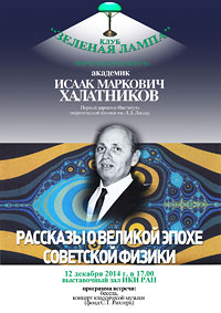 • 12 декабря 2014г. в ИКИ РАН состоится творческий вечер-встреча клуба "Зеленая лампа". Наш гость - Халатников Исаак Маркович - первый директор Института теоретической физики им.Л.Д.Ландау.
