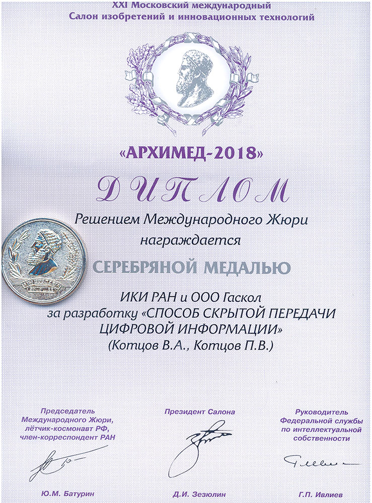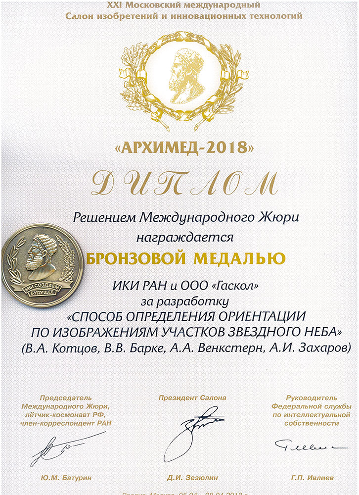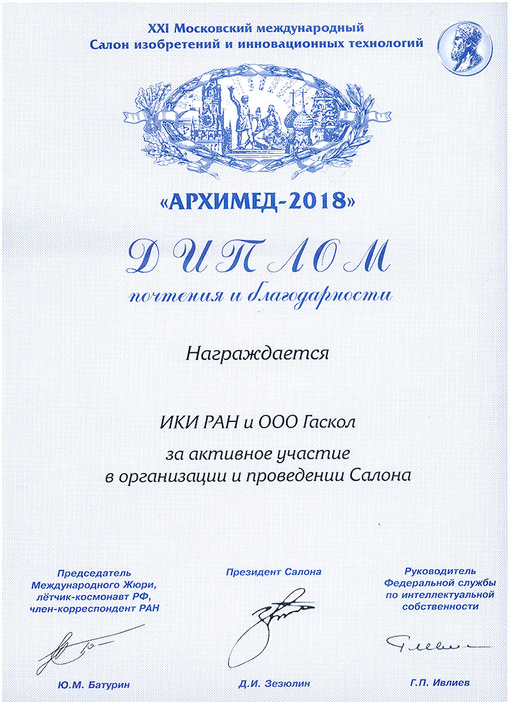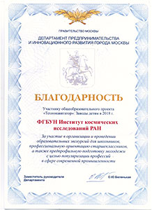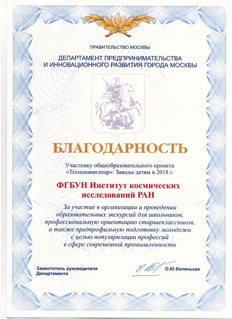 5 декабря 2018 г. ИКИ РАН награжден Дипломом благодарности за участие в организации и проведении образовательных экскурсий для школьников, профессиональную ориентацию старшеклассников, а также предпрофильную подготовку молодежи с целью популяризации профессий в сфере современной промышленности. Диплом подписан заместителем руководителя Департамента науки, промышленной политики, предпринимательства и инновационнного развития Москвы О.Ю. Беленькой.