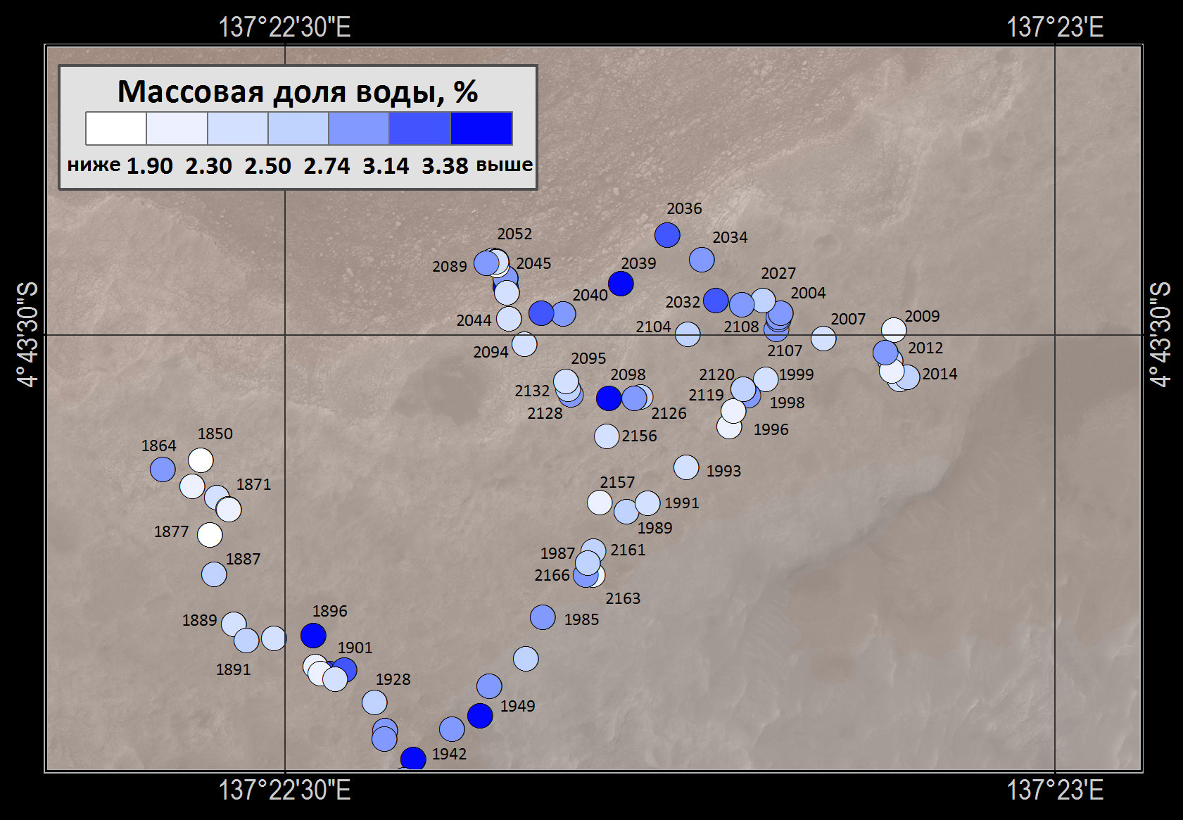 Карта активных измерений воды за 2018 год. Числами отмечены марсианские дни на поверхности Марса с момента посадки © ИКИ РАН, Отдел ядерной планетологии, 2018