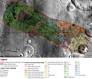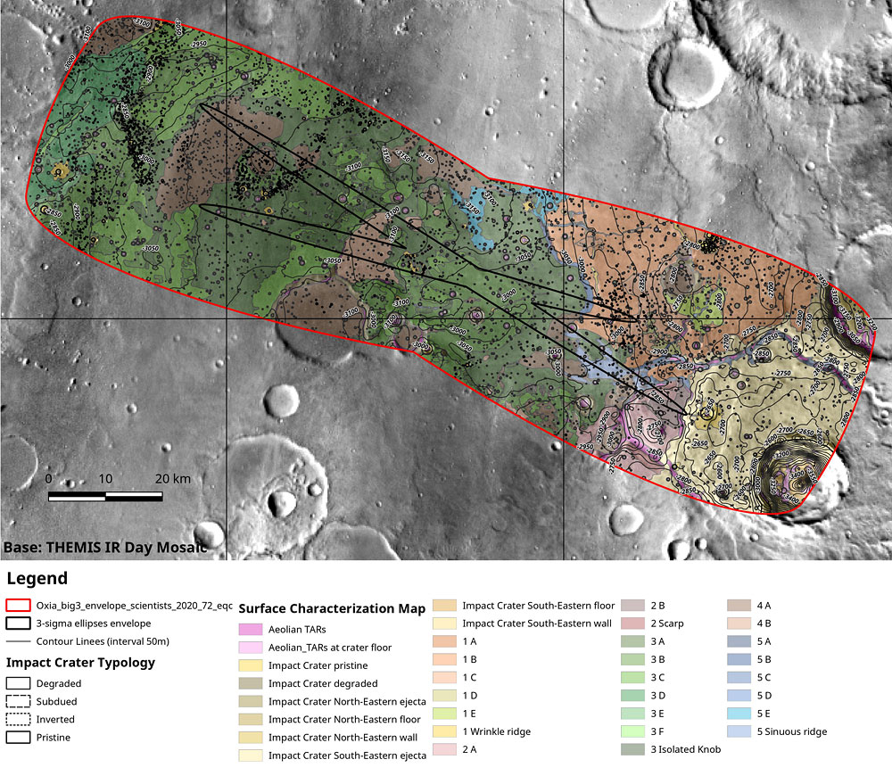 Карта участка на равнине Оксия с обозначенными эллипсами посадки. Цветами обозначены типы поверхности, различные линии обозначают типы кратеров. Фотография поверхности получено с помощью КА Mars Odyssey (НАСА) © IRSPS/TAS; NASA/JPL-Caltech/Arizona State University
