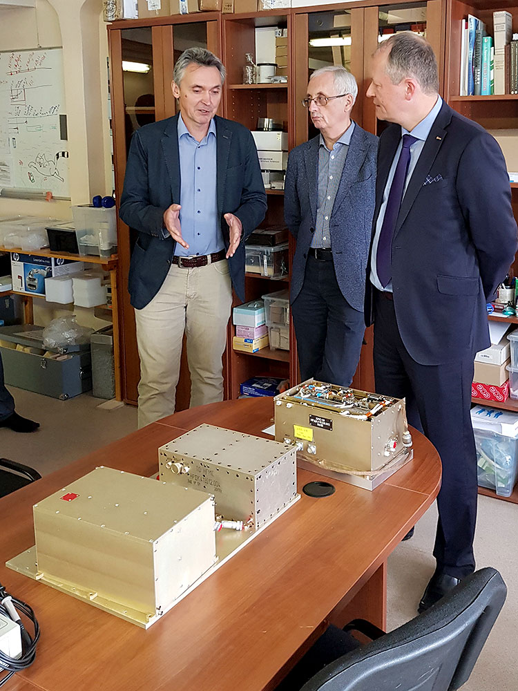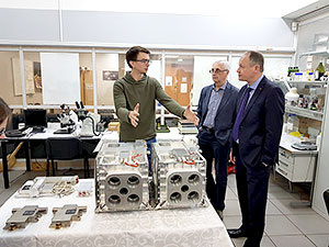 Ребята посетили производственные корпуса института, установки для термовакуумных, электромагнитных и климатических испытаний, где при них проводились испытания приборов, которые потом устанавливаются на борт космических аппаратов и отправляются в космос. Работники лаборатории продемонстрировали испытания приборов на виброустойчивость на виброустановке. Школьников проводили на механический участок опытного производства, где сотрудники производства показали обработку деталей на фрезерном обрабатывающем центре и токарном станке с ЧПУ.
