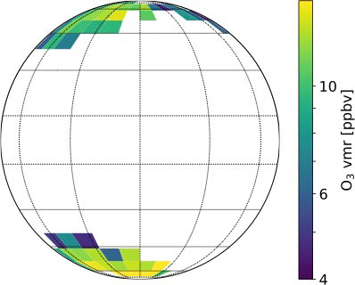 Цветом обозначено среднее содержание озона в год в атмосфере дневного полушария Венеры по данным КА «Венера-Экспресс»