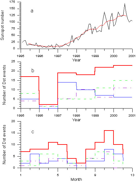 Dst < -100 нТ (штрих-пунктирная линия), с - зависимость числа магнитных бурь от месяца года (обозначения такие же, как на рис.2в).