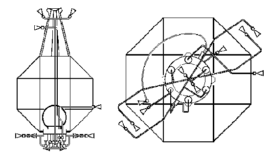 Fig.1 illustrates locations of OMACD and controlling nozzles on a subsatellite with respect to its axes.