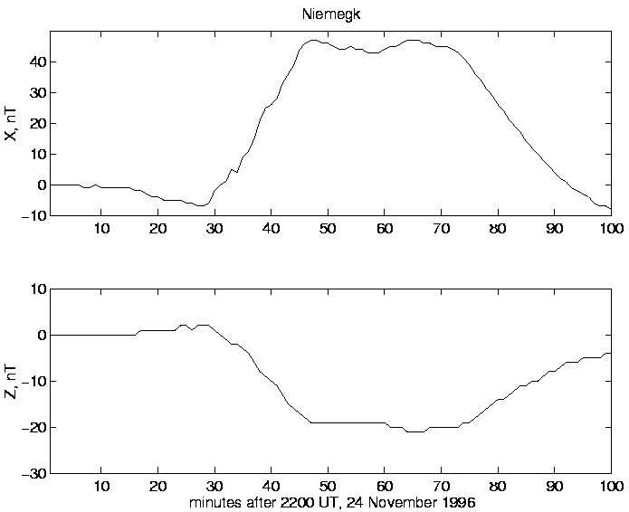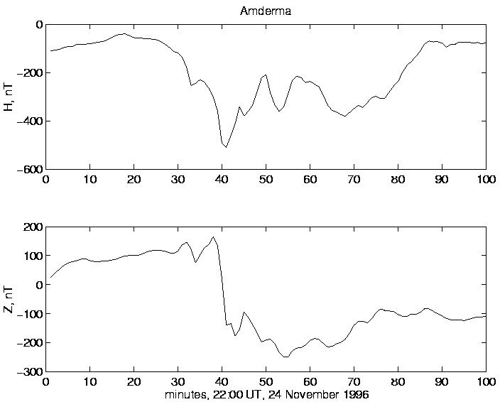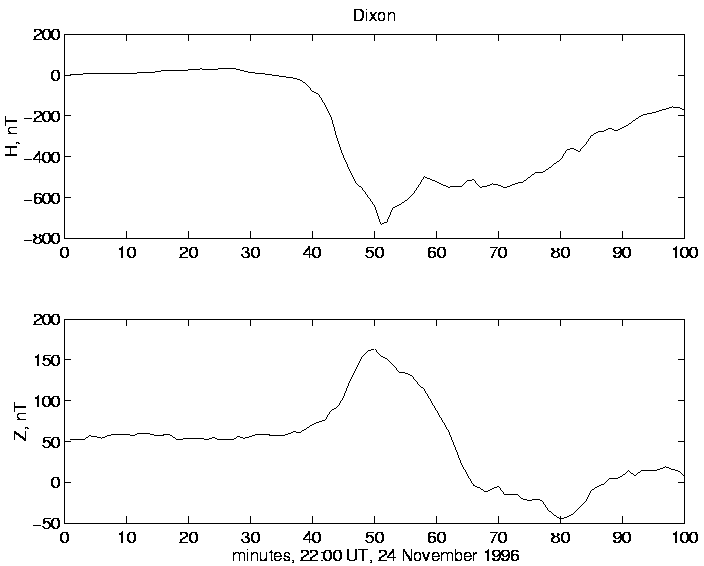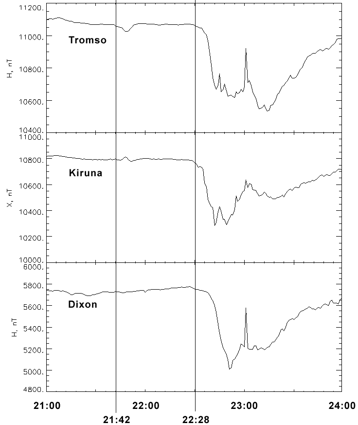2.  Global onset at 22:27 UT in the magnetotail, at nightside auroral zone and midlatitude magnetometers.