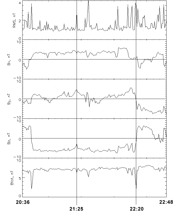 • 21:10 - 22:00 UT   Pronounced plasma sheet thinning (Bz decrease)