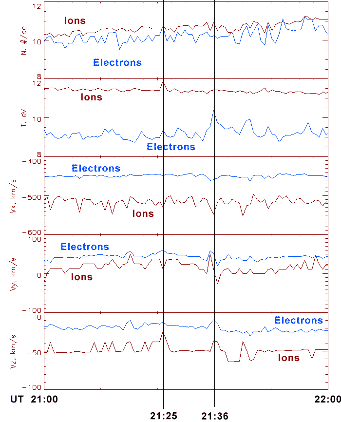 A change in the IMF Bz (from -5.5 to 0 nT), solar wind plasma density and velocity variations, at 21:25 UT.