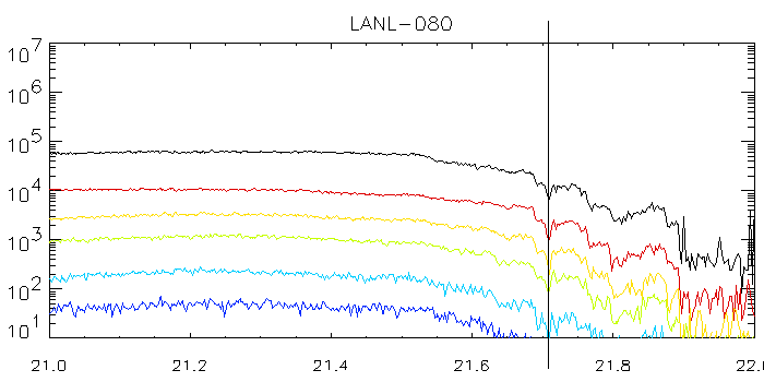 The LANL-080 picture shows the electron intensity profiles at the geosynchronous orbit. A small dip indicated by the black line is most probably caused by the magnetic field decrease, unfortunately unsupported by the onboard magnetometer measurements because of their absence.