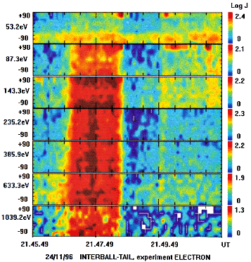 The INTERBALL Tail probe ELECTRON particle spectrometer data snapshot taken in the North Lobe shows a burst of electrons of 1 keV and below, rather isotropic, but somewhat like counterstreaming at 143 eV energy. CORALL particle spectrometer data detected 1 keV ions.