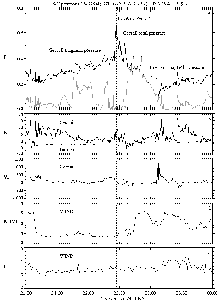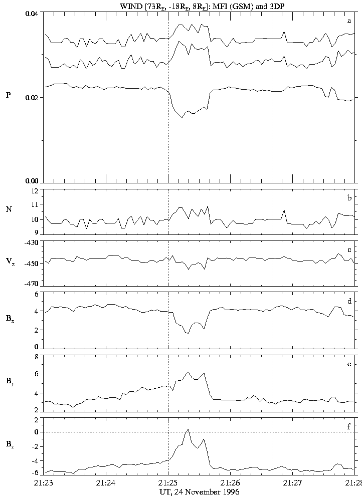 During the growth phase, an interesting feature was detected in the solar wind: a small perturbation in Bz near the 21:25 UT (change from -5.5 to 0 nT), also seen in the plasma parameters. According to the WIND position (Xgsm = 72 Re, Ygsm = -18 Re) and particle velocities, time delay needed to take into account solar wind travelling time is approximately 18 minutes.