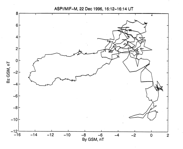 Hodograph presented in Fig.10 shows that magnetic field change has more complicated type than usually observed in magnetic flux rope, e.g. on the whole in the Y-Z plane the vector of magnetic field went around point with coordinates By ~ -3 and Bz ~ 3 and radius ~ 2 nT, but it had 2 short trips (distances were 12 and 7 nT, respectively) in -By and -Bz directions.