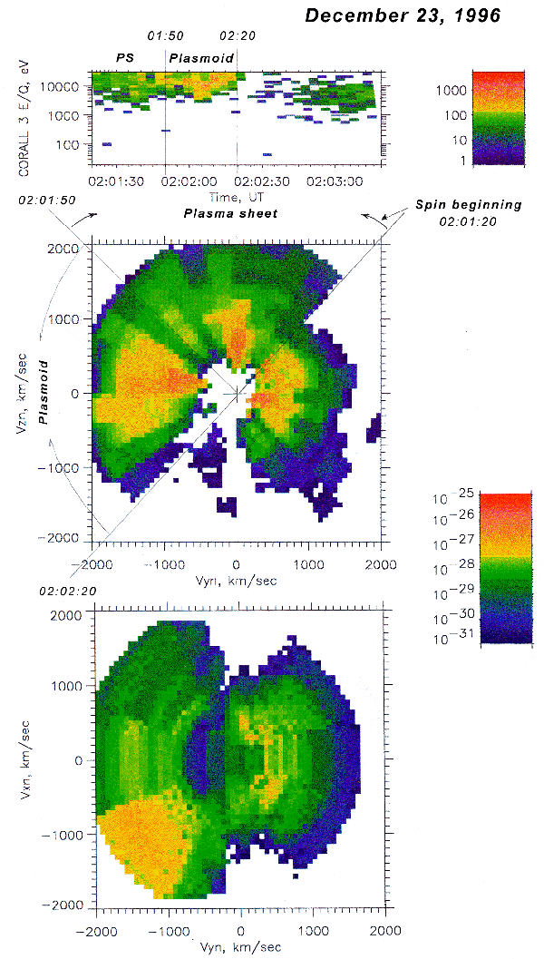 At the beginning of 4th substorm the Tail Probe observed a tailward plasmoid. Fig.11 presents ion energy spectrogram (top panel) for time interval 02:01:20-02:03:20 on December 23, 1996, and two projections of ion distribution for the same time interval: in plane perpendicular to spin axis (middle panel) and in plane contained the spin axes (bottom panel). Duration of plasmoid was near 30 sec.(about 1/4 spin period). So, at the beginning of spin the CORALL observed the PS plasma during ~ 30 sec and then the plasmoid was observed. PS ions disappeared at ~ 02:02:20 UT and then plasma with lower energy (PSBL) was observed. Taking into account that CORALL does not measure ions in cones near spin axis, distribution on bottom panel shows that plasmoid moved tailward.