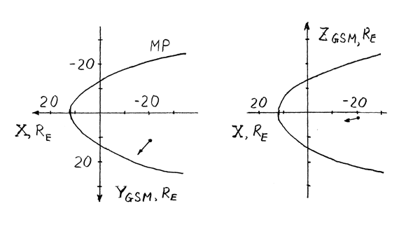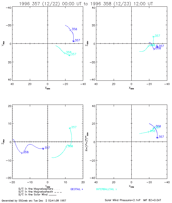 Orbits of INTERBALL/Tail Probe and GEOTAIL for December 22-23, 1996, are shown in Fig.12 in GSM frame. Both satellites have approximately the same X ~ -20 and Z ~ -3 RE, but the Y difference is about 20 RE, i.e. they were located in different flanks of magnetic tail.