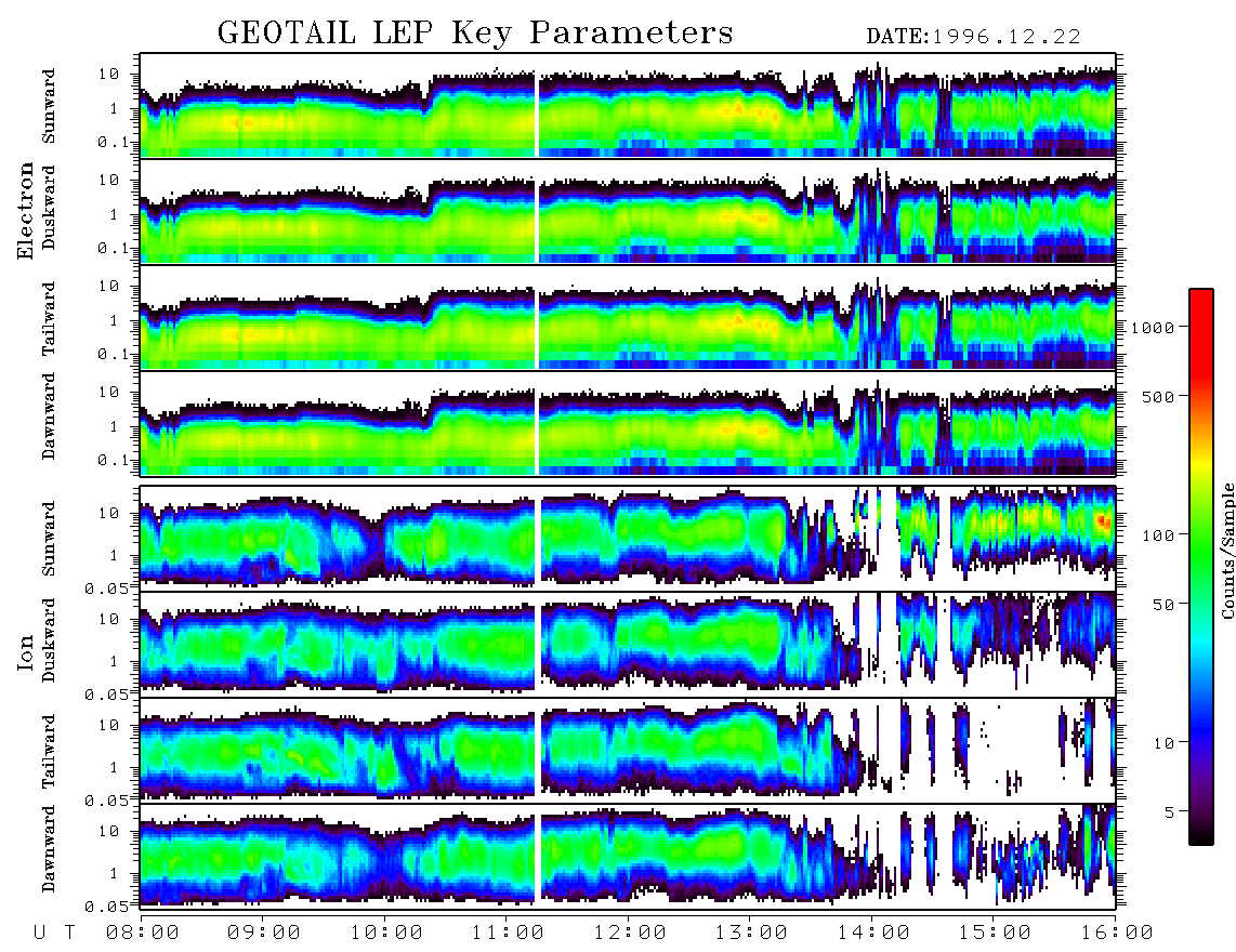 Fig.13 presents a 8-hour example of ion and electron energy spectrograms measured on December 22, 1996 on GEOTAIL. Initially GEOTAIL was in the PS. The beginning of 1st substorm at ~ 12:50 UT coincides with disturbances in the spectrograms. At 13:20 UT and latter we see more strong plasma disturbances and PS plasma disappearances (similar to Tail Probe observations).