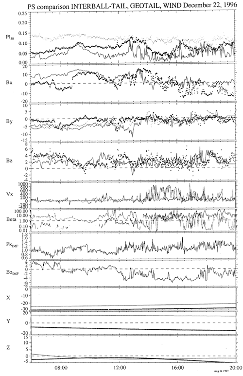 Fig.14 allows us to compare INTERBALL/Tail Probe (solid line) and GEOTAIL (diamonds) key parameters: total pressure, 3 components of magnetic field, Vx velocity component, beta-parameter and a set of solar wind parameters. Taking into account of differences in measurement methods on both satellites, it is possible to get significant information about temporal and spatial scales of events. Pressure increases in 1st panel at ~ 12:00-13:00 and 15:30-16:30 UT indicate the growth phases of 1st and 2nd substorms.