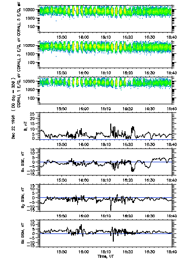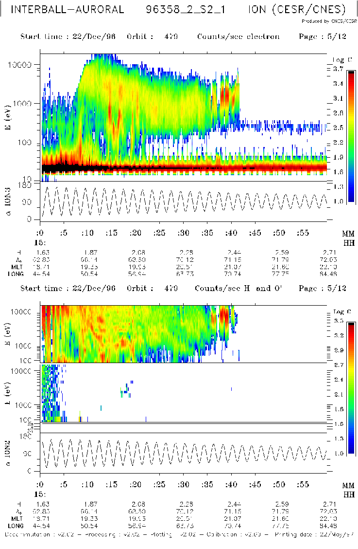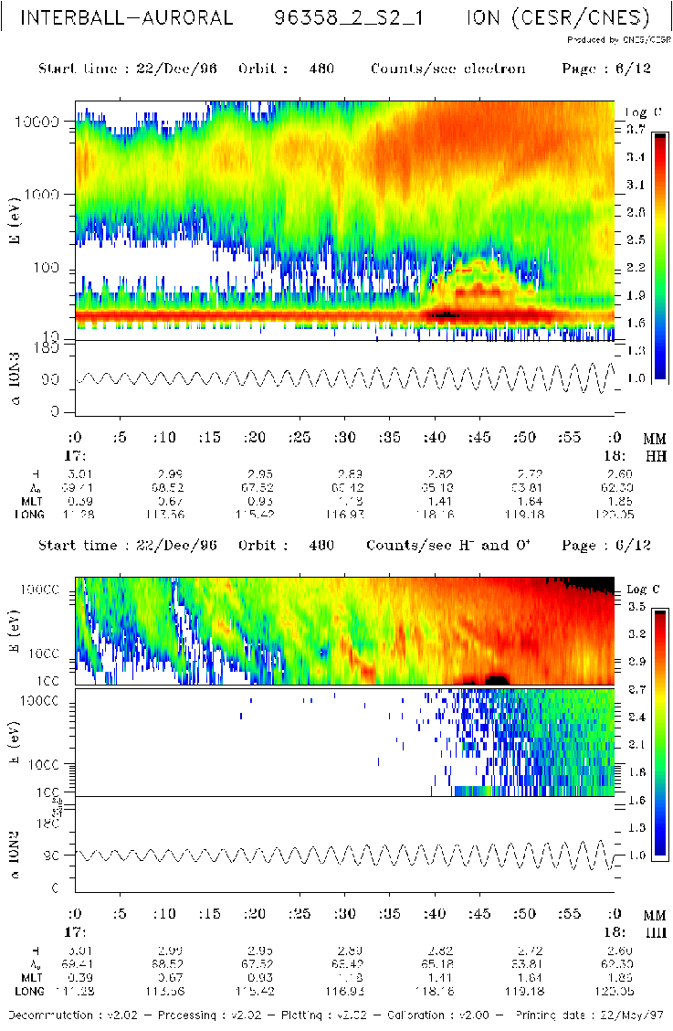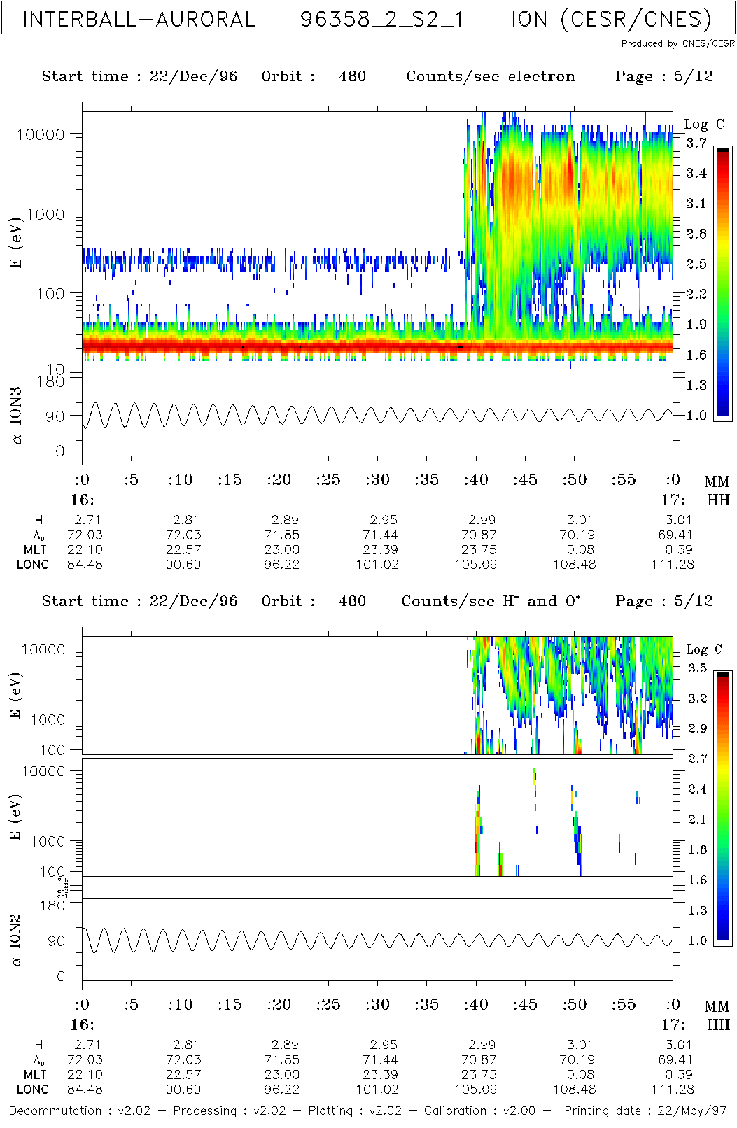 As have been shown by the diagram in Fig.4, there was a good data set obtained on INTERBALL/Auroral Probe in the auroral zone and polar cap during 2nd, 3rd and 4th substorms. Fig.15 (a,b,c) present ion, O+ and electron energy spectrograms measured with ION instrument during time intervals at 16:00-17:00 and 17:00-18:00 UT on December 22, 1996, respectively. In auroral zone which began at ~ 16:38 UT the instrument observed ion injections with the time-of-flight energy dispersion. Estimates shows that these ion fluxes probably originate at the distance ~ 15-20 RE from the observation point. Simultaneously with the injections the upward O+ fluxes with energy up 10 KeV were observed.
